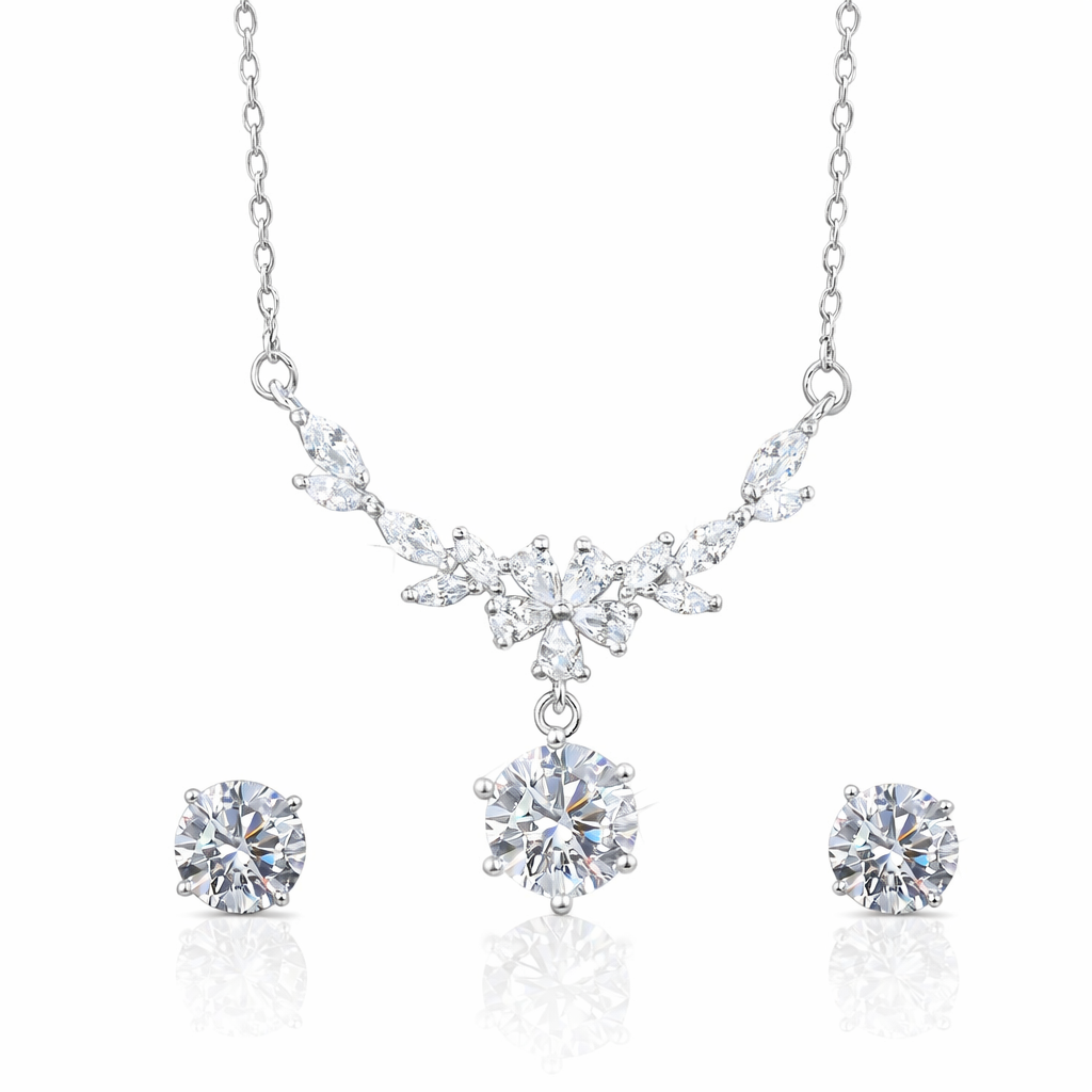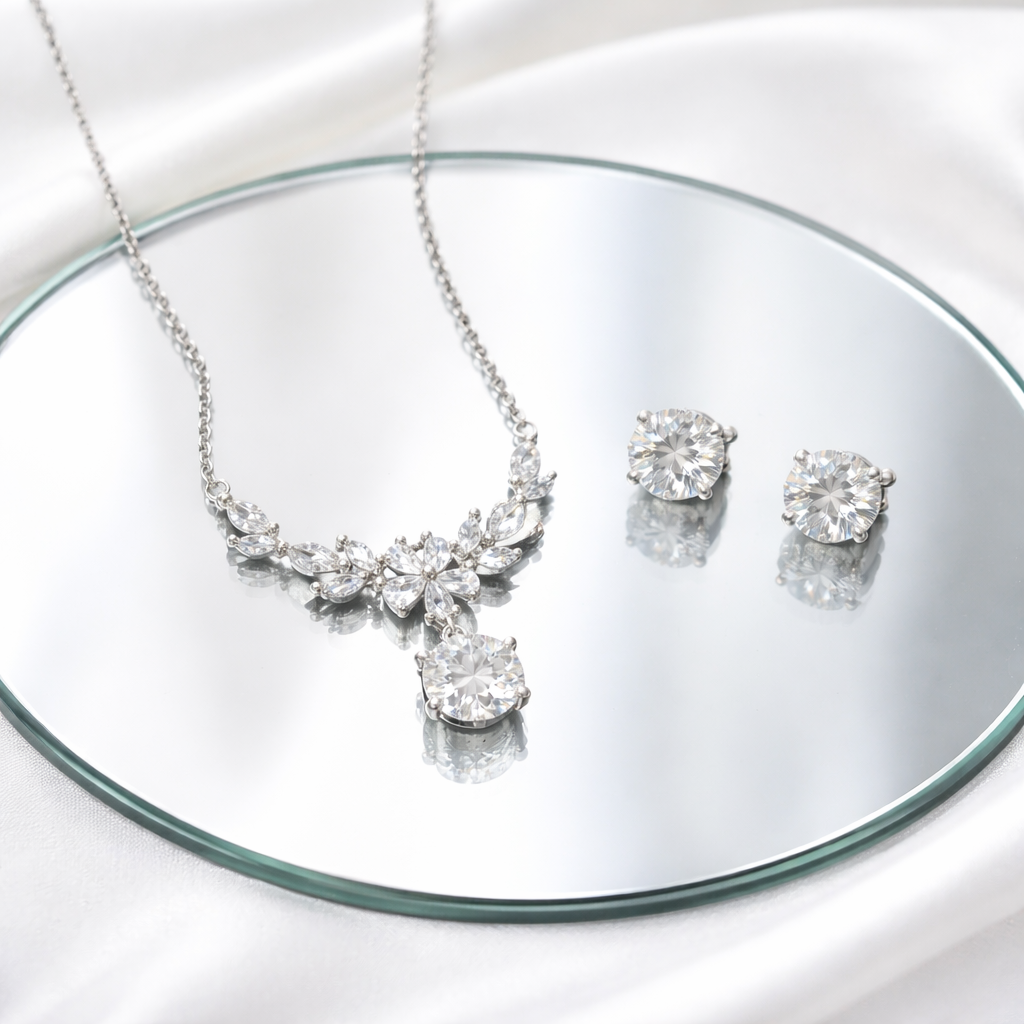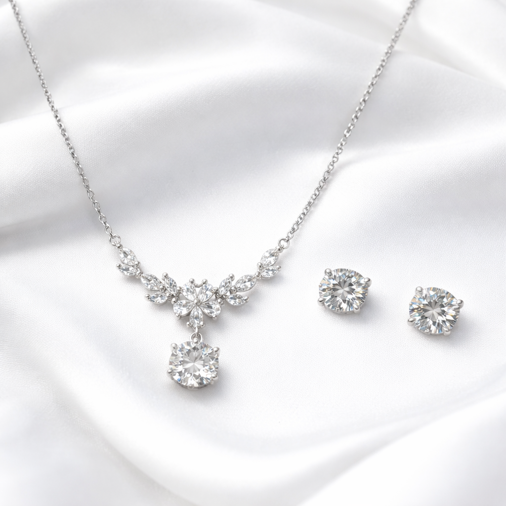 Zirconiile au o lumină clară și intensă, care se vede frumos din orice unghi, fără să fie prea mult. Colierul are un detaliu delicat în partea de sus, care dă finețe întregii piese, iar piatra centrală completează setul exact cum trebuie — simplu, elegant, sigur pe el.